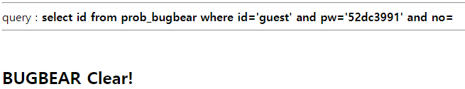 select id from prob_bugbear where id='guest' and pw='' and no=123||instr(id,"admin")&&instr(ord(mid(pw,1,1),48) 는 HeHe가 출력되며 종료된다.