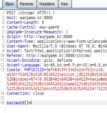 프록시툴인 burpsuite를 이용해 확인하면 다음 그림과 같이$_POST['password'] 는 password=파라미터값으로 나타난다.